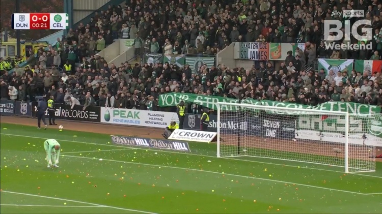 10月20日讯 《太阳报》报道,凯尔特人球迷对其俱乐部董事会的抗议行动在本周客场对阵邓迪FC的比赛中再次升级,并导致比赛在开球后不久便中断了三分钟。愤怒的凯尔特人球迷向场内投掷了大量网球、小型弹力球甚至橘子,一度铺满了本方进攻方向的禁区。