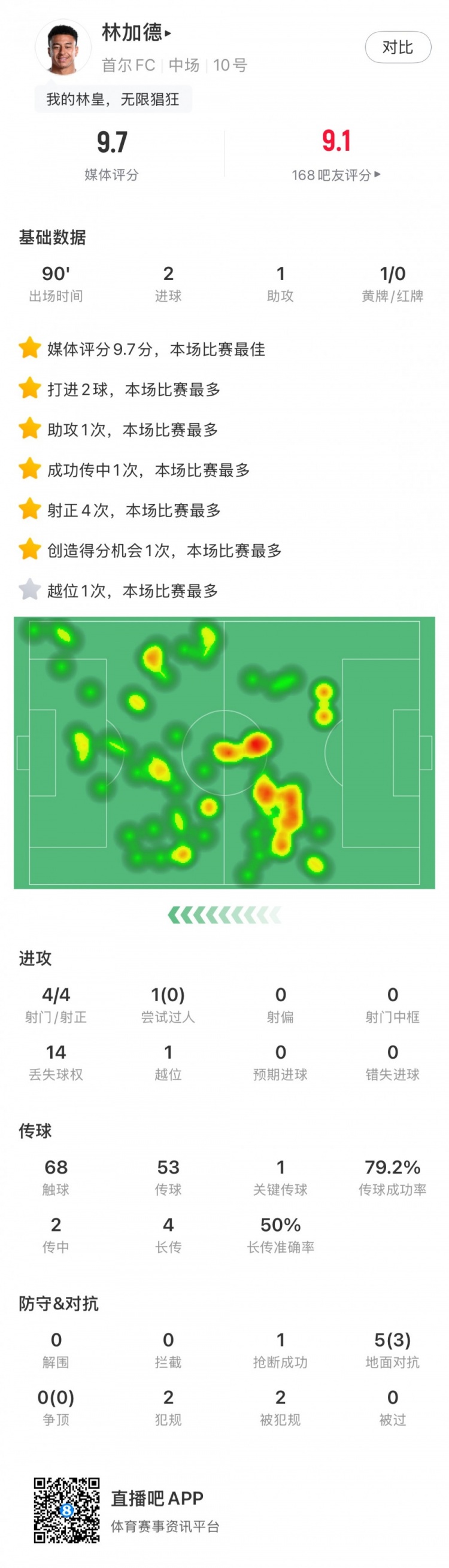 本场比赛“林皇”林加德直接参与首尔FC全部进球,贡献2射1传,赛后踢满全场的他获得了全场最高的9.7分。
