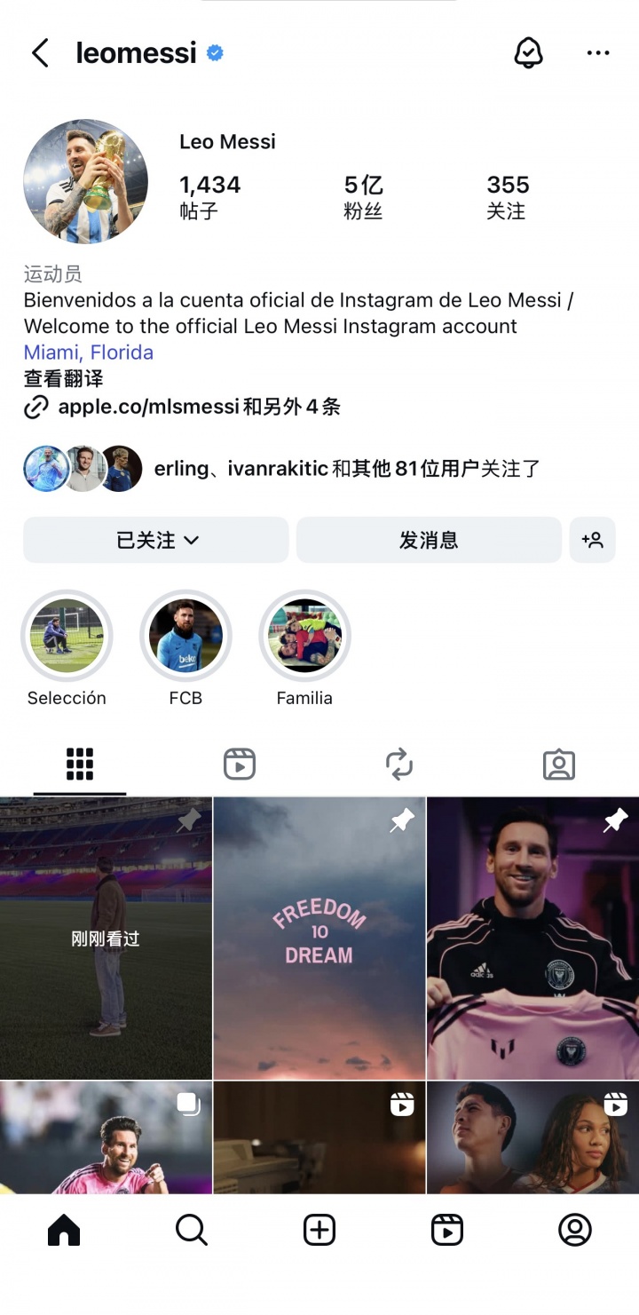 目前梅西已将这条动态在ins置顶,且置顶权重最高。梅西的其余两条置顶分别为与迈阿密国际续约,以及宣传迈阿密国际青训营。