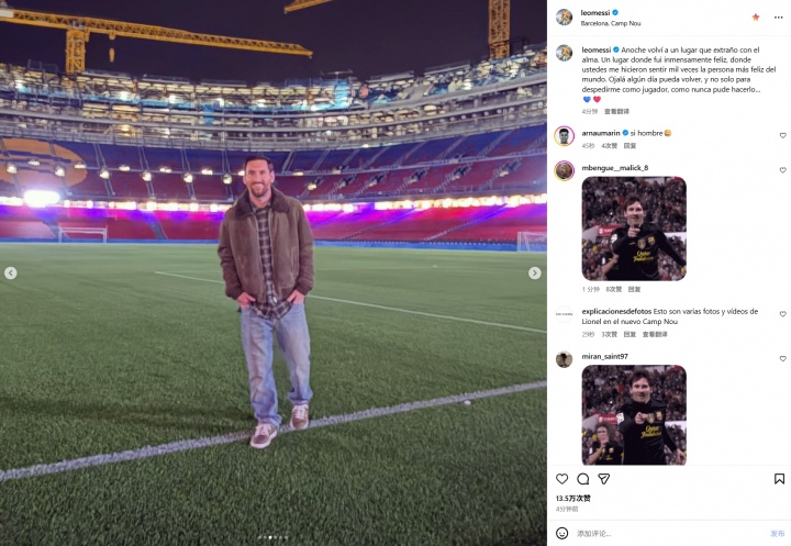 梅西写道:昨晚我重归一处我魂牵梦萦的地方。那个曾让我无比幸福的地方,你们让我无数次成为世上最幸福的人。但愿有天我能归来,不止是以球员身份作别——就像我始终未能完成的那样……????❤️